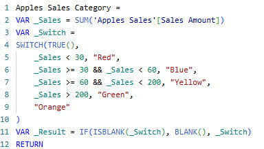 The switch function is very powerful, and it does very well working with conditional statements in DAX. A great scenario is if you have a large nested if statement.